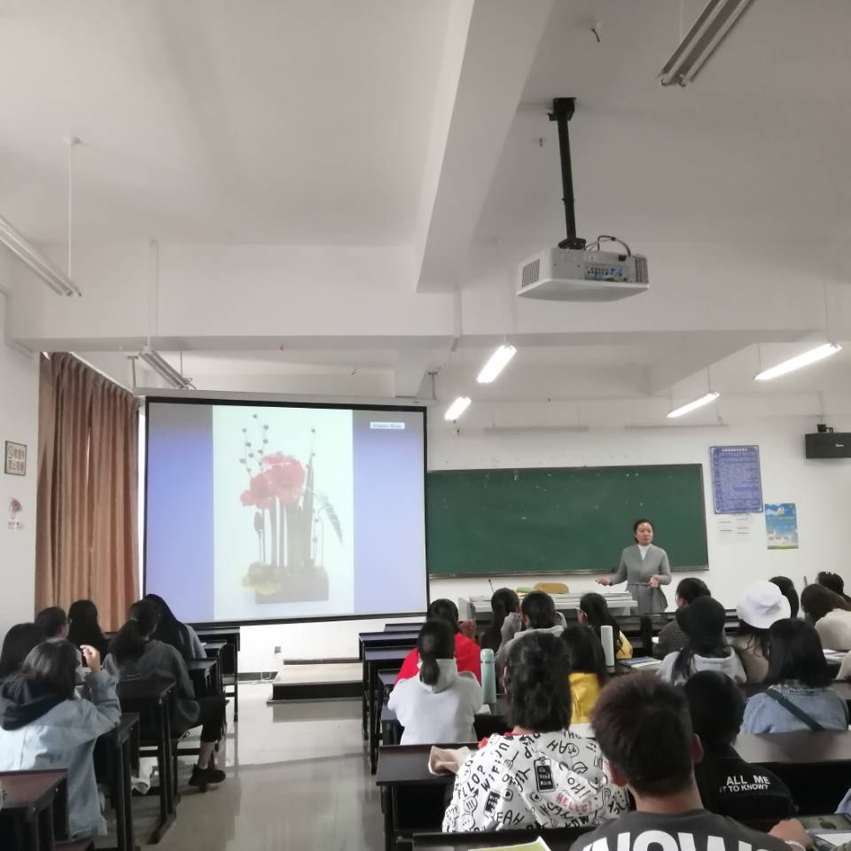 讲座中,周丽贞老师首先向同学们展现出一些插花作品,然后向同学们提出一些问题,与同学们以互动的形式开始了本次讲座,随后老师便向同学们介绍了插花的含义和插花与花艺的关系,然后又向我们概述了插花艺术的历史与发展以及插花的应用领域。