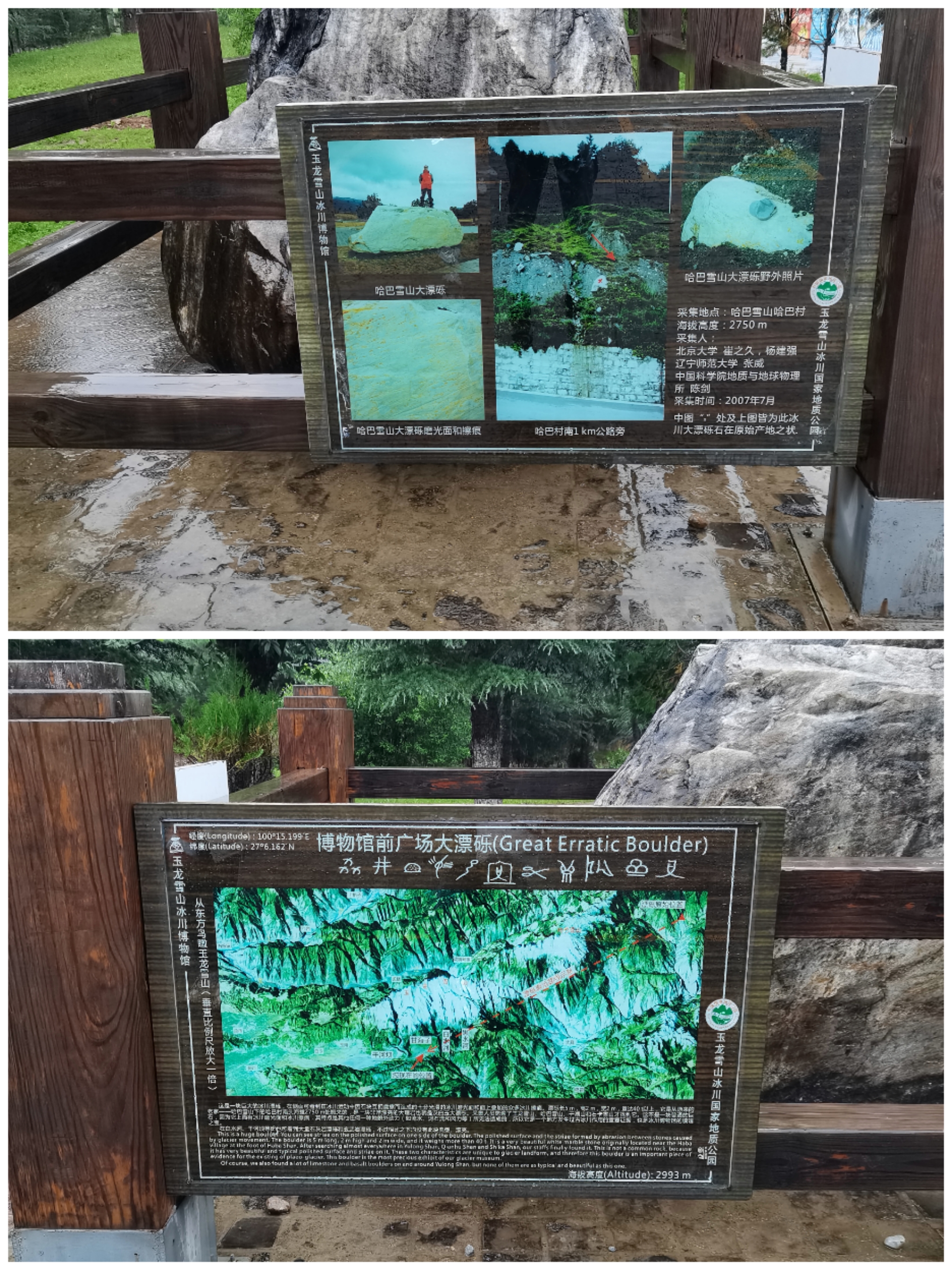 今天是活动开展的第二天,本来原计划是到冰川公园,后来因为天气的原因,就打算先去冰川博物馆参观,到博物馆门口看到了巨大的漂砾,是在海拔2750米哈巴雪山哈巴村采集到的,一看就是一个伟大的工程,这块巨石也成为了玉龙雪山冰川博物馆的一大鲜明标志。出乎意料的是博物馆今天闭馆了,所以导致不得不临时改变活动计划,出发蓝月谷。