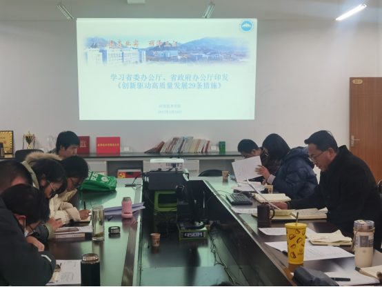2022年1月10日,应用技术学院在北实验楼305召开了省委办公厅、省政府办公厅印发的《创新驱动高质量发展29条措施》专题学习会议,会议由院长高培仁同志主持,全院教职工参加了会议。