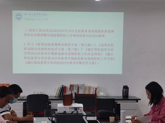 兰玉倩副院长领学《高等学校新冠肺炎疫情防控技术方案(第六版)》《新型冠状病毒肺炎防控方案(第九版)》,高培仁院长领学《丽江师范高等专科学校2022年秋季学期开学方案》《丽江师范高等专科学校2022年秋季学期新冠肺炎疫情防控工作应急预案》《丽江师范高等专科学校2022年秋季学期新冠肺炎疫情防控工作方案》。