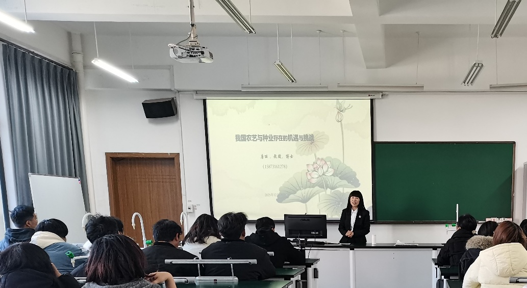 为充分发挥银龄老师的示范引领作用,让学院广大师生接受科技前沿信息,2025年12月19日,银龄教师唐丽教授在理工楼北201教室为学院教师和园艺技术专业学生作了一场题为《我国农艺与种业存在的机遇与挑战》的学术讲座。