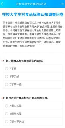 职教周系列活动中负责调查的小分队在指导教师指导下开展问卷调查的题目设计,确定最终题目后,发布二维码,邀请活动现场学生以及感兴趣的同学扫码进行答题,进行相关知识交流,同学们都积极参与,共有323名同学参与答题,同学们在这次答题中更好的了解食品标签的要求并对食品营养标签有了专业的认知。