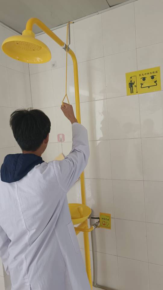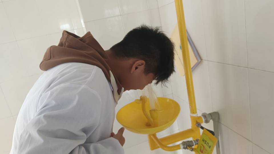 应急演练对实验室废弃物的正确处理、实验室个人安全防护用品正确取用、化学品倾洒紧急处置、应急喷淋洗眼设施实操体验等项目进行培训。培训过程中模拟了实验室事故上报流程,面对实验室安全事故时如何有效组织、快速反应、高效运转、临危不乱,最大限度地减少事故损害等方面对师生进行培训。