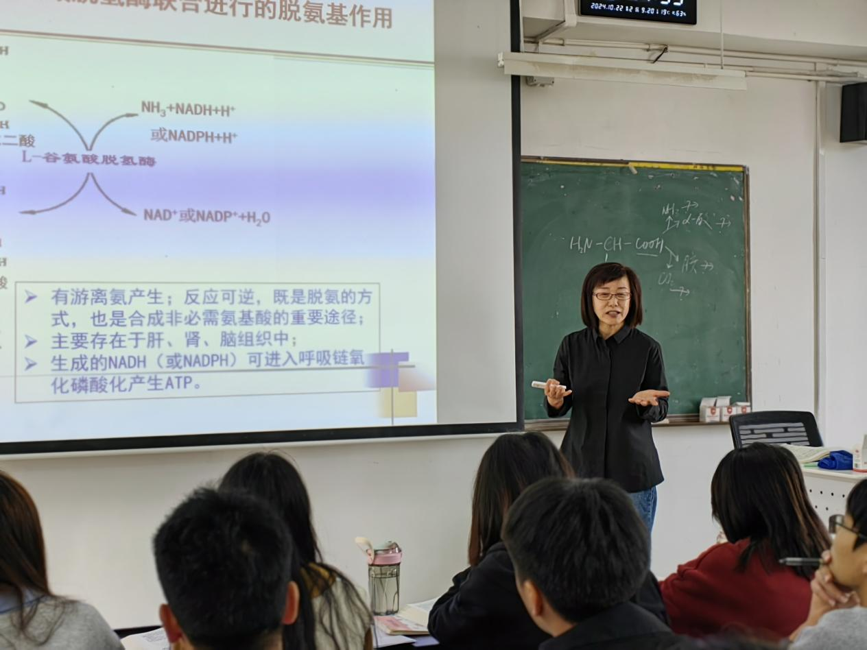 朱梅教授以“课前一练”开题,引入课程内容《氨基酸的共同分解代谢》。朱老师的课堂充满激情,逻辑思路清晰,课堂气氛活跃,教学效果良好,充分展示了朱梅教授的教学智慧和教学魅力。观摩教师们认真听讲,从教学内容、教学方法、教学设计、教学效果等方面对本次示范课做出了评价,分享了自己参加观摩活动的体会,收获颇丰。