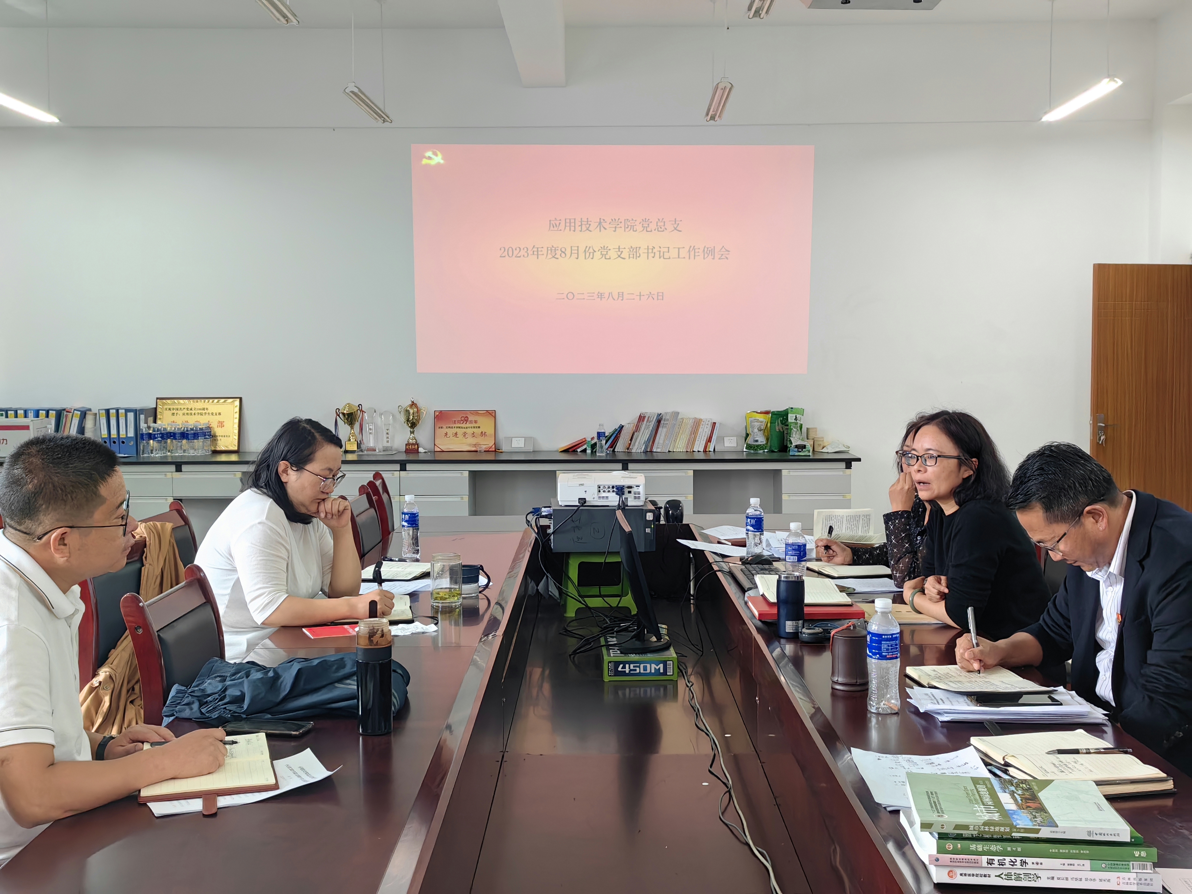 2023年8月26日下午, 应用技术学院党总支召开了2023年8月份党支部书记工作例会。会议由学院党总支书记李燕梅主持,党总支副书记、纪检委员、专职组织员、支部书记参加会议。