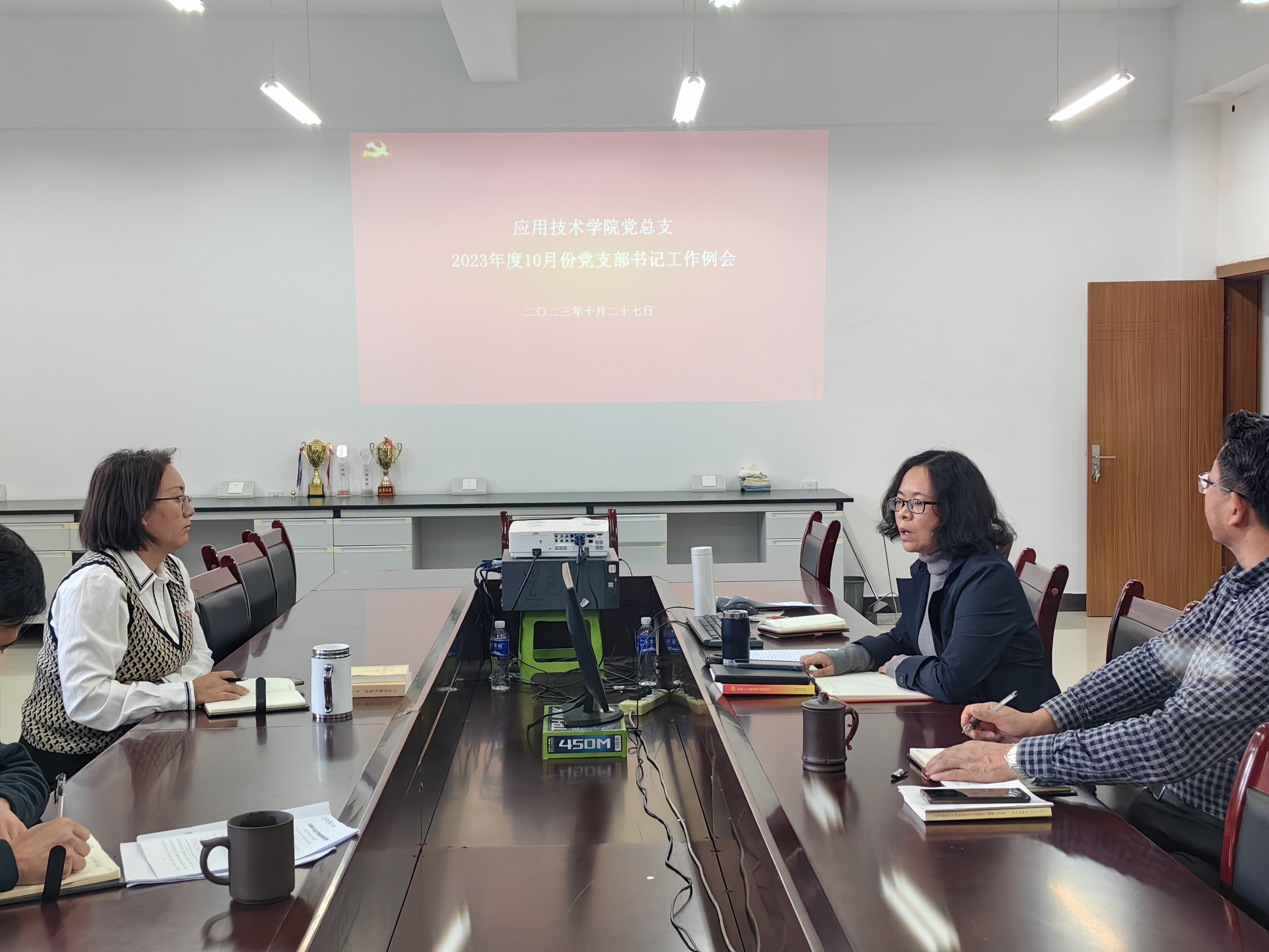 2023年10月27日下午, 应用技术学院党总支召开了2023年10月份党支部书记工作例会。会议由学院党总支书记李燕梅主持,党总支副书记、纪检委员、专职组织员、支部书记参加会议。