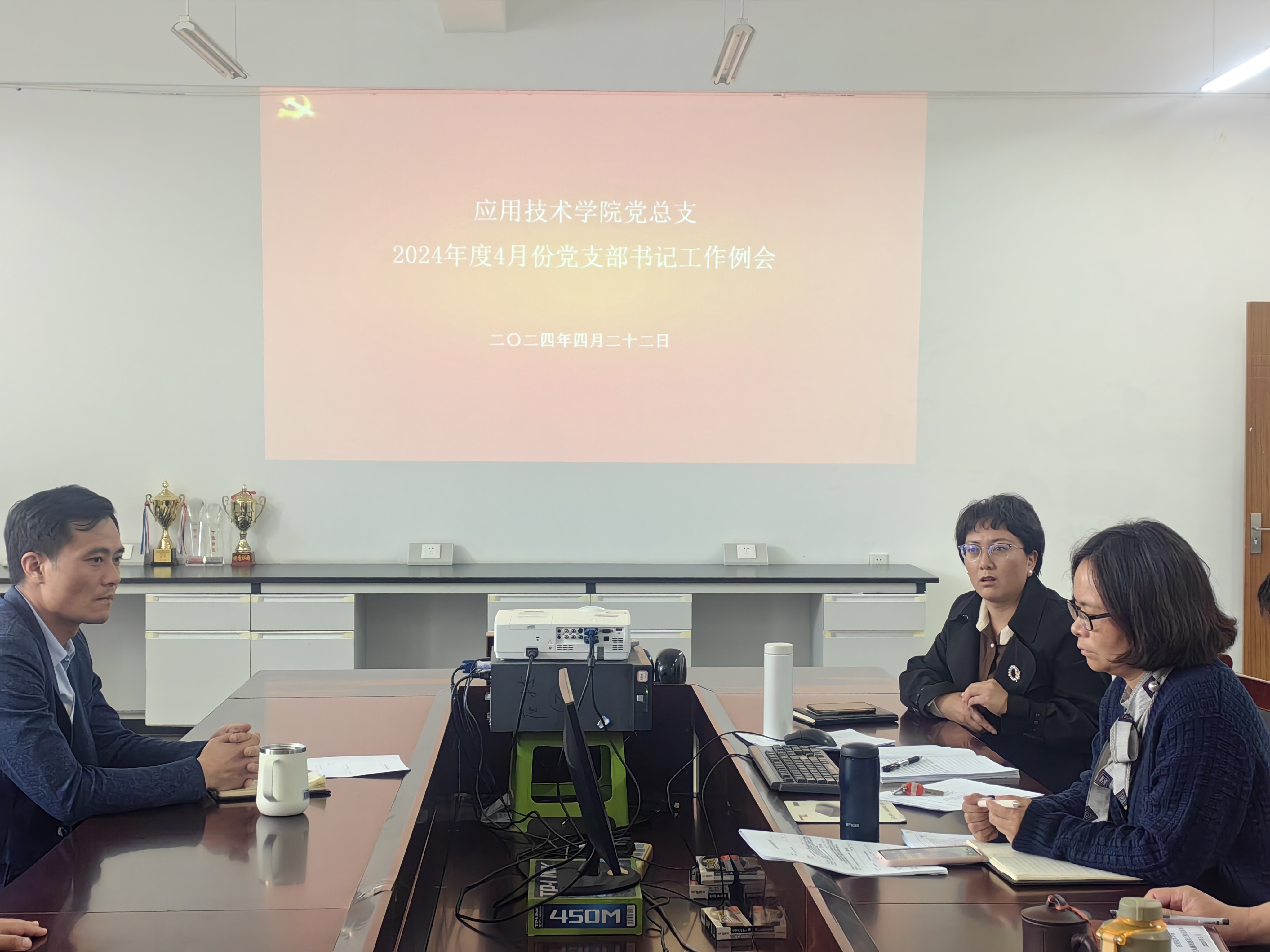 2024年4月22日中午, 应用技术学院党总支召开了2024年4月份党支部书记工作例会。会议由学院党总支书记李燕梅主持,党总支副书记、纪检委员、专职组织员、支部书记参加会议。