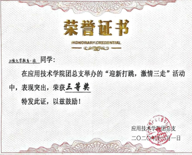 2、组织参加学校及学院活动。同学积极投身于校园文化活动之中,支部在应用技术学院组织举办的“迎新打跳,激情三走”比赛中,荣获三等奖。